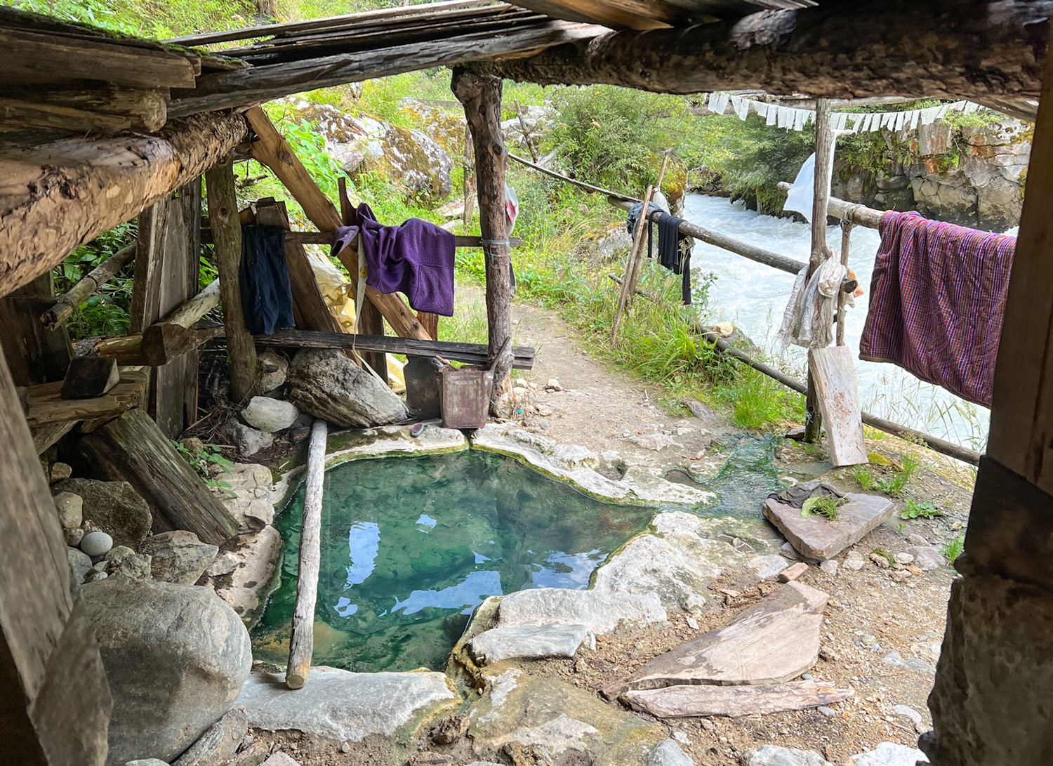 On the descent we spotted a heard of blue sheep perched high on the cliffs above us. Intentional or not, they kicked a few rocks off the cliff that shattered near the trail below so we quickly skirted the boulders and dropped into a think jungle canopy. Once we reached the bottom we followed the raging river to our hot spring oasis.