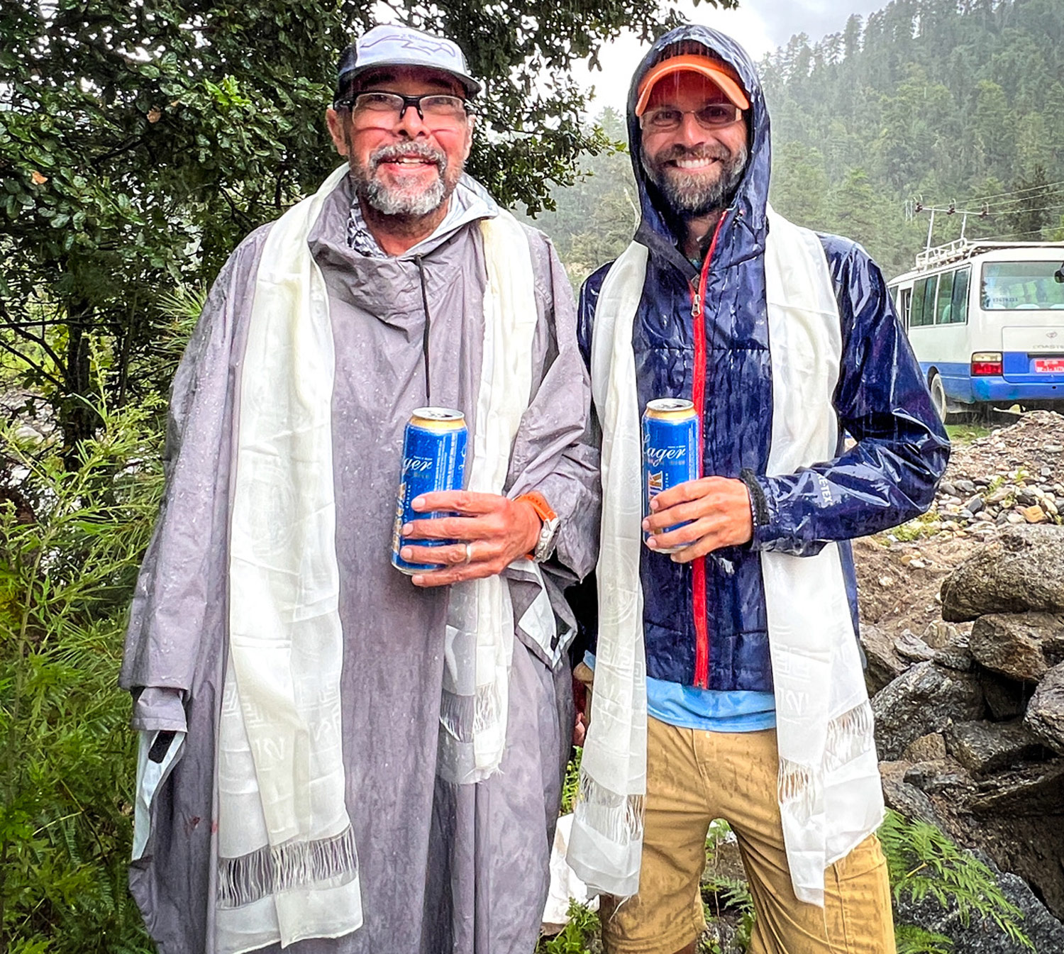 I was jolted out of my quiet introspection when I crested a hill in a light mist and saw our crew truck and a table waiting with chocolate cake and cases of Druk lager. We were adorned with white silk sashes and as the rain grew heavy the crew lightheartedly danced and sang songs getting drenched one last time before climbing in the bus and drying out in town.